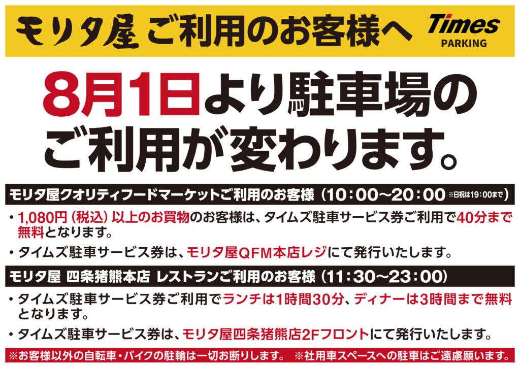 本店お知らせ:8/1より駐車場のご利用が変わります。